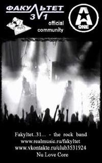 Группа ФАКYЛЬТЕТ-31 образовалась в г.Белгороде в недавнем прошлом, и сразу же заняла свою нишу в музыкальной среде, как неординарный и оригинальный коллектив. ФАКYЛЬТЕТ-31 - играет не тяжелую, мелодичную альтернативу, хотя в репертуаре группы присутствуют и довольно жесткие песни. Экспериментируя с музыкой и ее стилями группа сразу обратила на себя внимание, как интересный продукт, каждый раз подчеркивающий свою индивидуальность. Как говорят сами музыканты: “Мы хотим играть музыку, которую будут именно слушать, а не ставить как фон на какой-нибудь тусовке. Музыку, в которой была бы сила,неподдельные эмоции, романтика." За время своего существования коллектив отыграл множество концертов в Белгороде и других городах России. ФАКYЛЬТЕТ-31 играл с такими коллективами, как ТТ-34, Jane Air и д.р. Зимой 2008 года, после довольно-таки продолжительного затишья группа вновь возродилась,практически самым первым составом. В ближайшие планы группы входит обширная концертная деятельность, запись новых треков, и очень приятный сюрприз для всех поклонников!